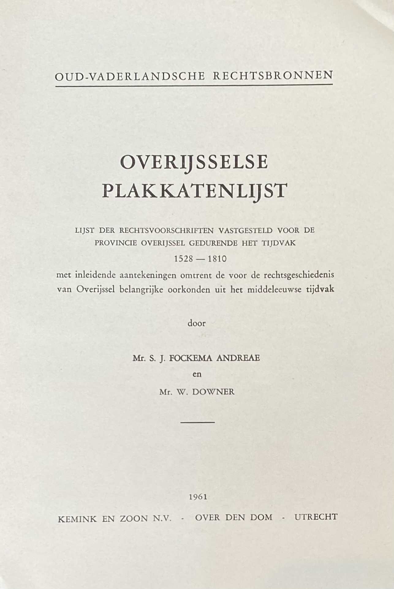 Overijsselse Plakkatenlijst. Lijst der rechtsvoorschriften vastgesteld voor de provincie Overijssel gedurende het tijdvak 1528-1810 met inleidende aantekeningen omtrent de voor de rechtsgeschiedenis van Overijssel belangrijke oorkonden uit het middeleeuwse tijdvak (Oud- Vaderlandsche Rechtsbronnen / Werken der Vereeniging tot Uitgave der Bronnen van het Oud-Vaderlandsche Recht, Derde Reeks No. 18)
